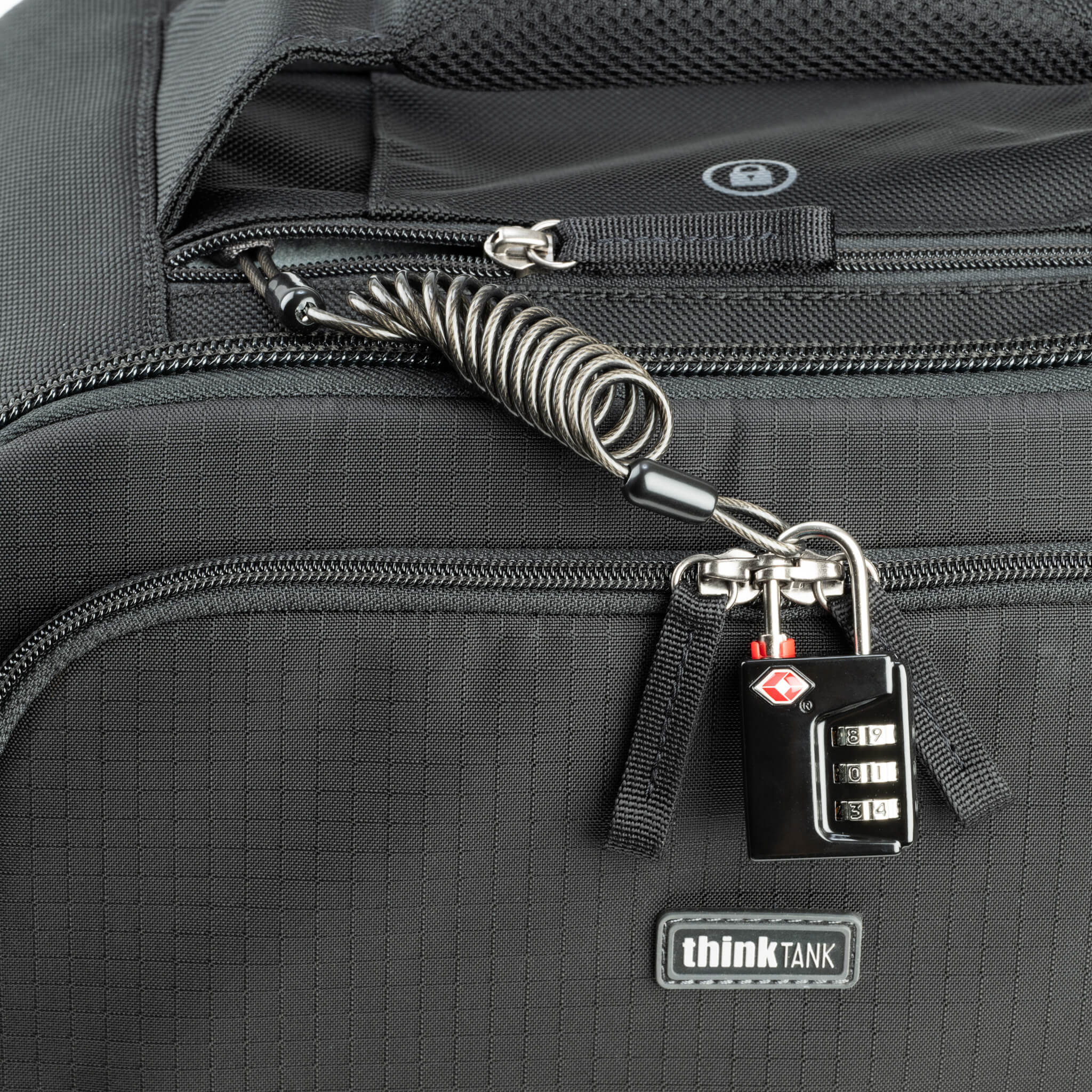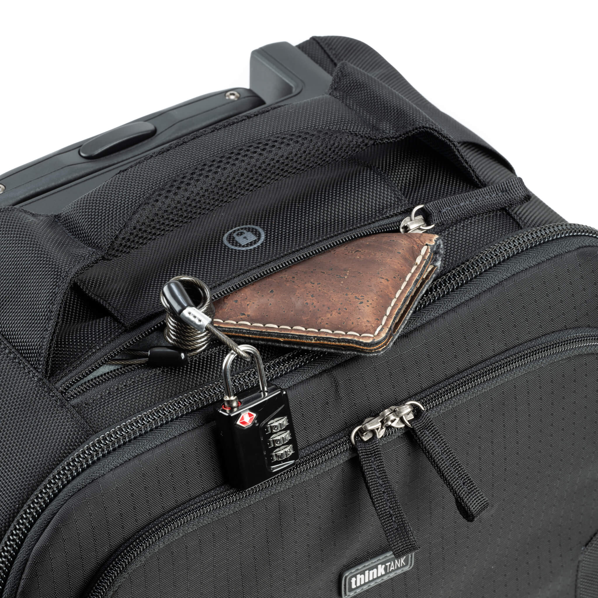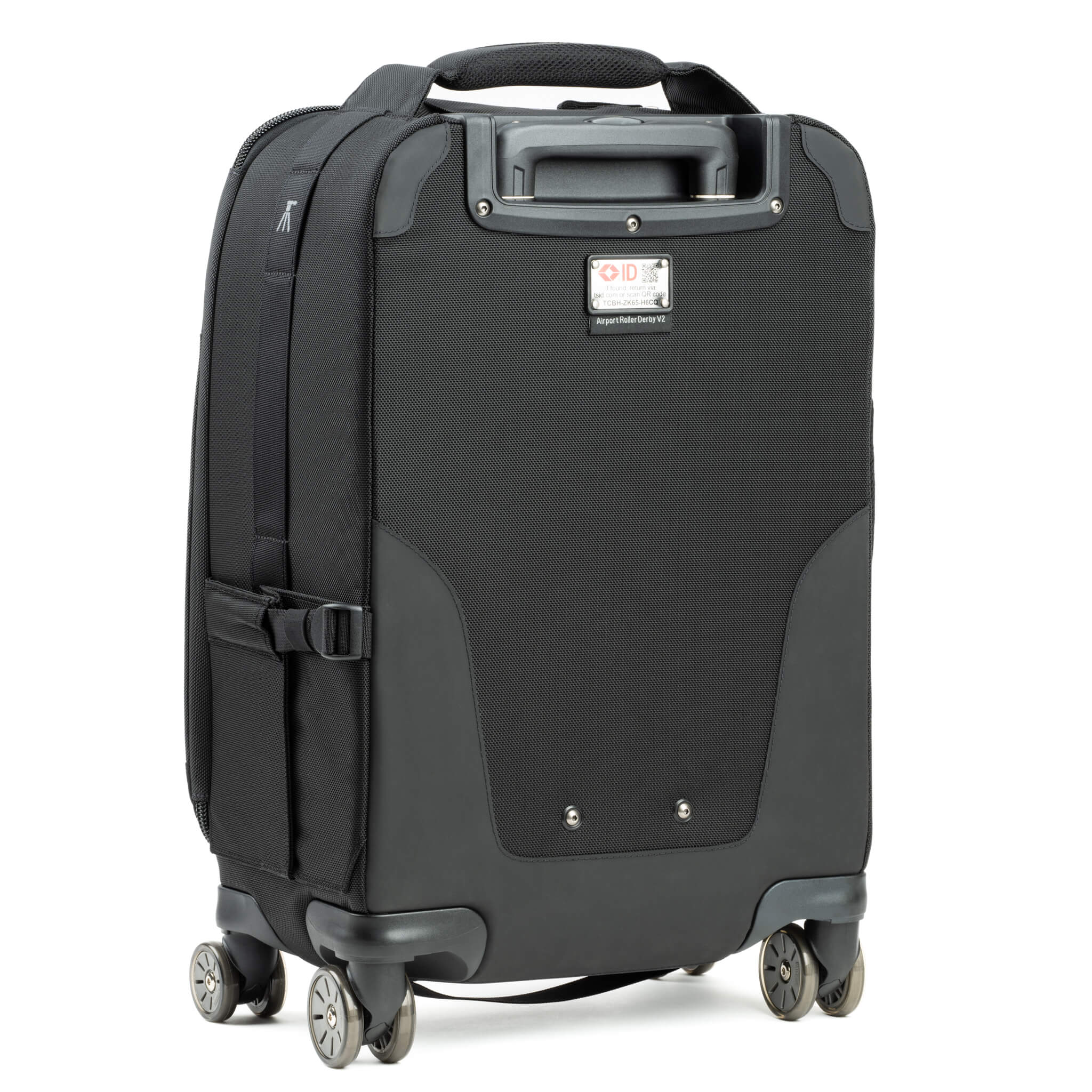 lenses attached Airport Roller Derby V2 Airport Roller Derby V2 Roller Derby V2 (side view) Top zippered pocket stores security cable and lock. Can also be use for flat items 4 dual-wheel sets provide 360 degree maneuverability in tight spaces Deep front pocket with organizer and laptop sleeve Roller Derby V2 (side view) Expandable side pocket for water bottle or tripod (straps included) Included tripod strap with locking SR buckle TSA Zipper Lock for main compartment Reinforced back panel for increased durability Lock and cable to secure and tether the bag. Computer compartment now includes Lockable YKK® RC Fuse Zippers Reinforced corners for increased durability Travel Sentry security ID plate features a unique ID number to assist in retrieving lost bags Key lanyard in front zippered pocket Fits a 16” MacBook Pro and 12.9” iPad Pro in dedicated, padded pockets Roller Derby V2 (side view) Expandable side pocket for water bottle or tripod Rain cover included