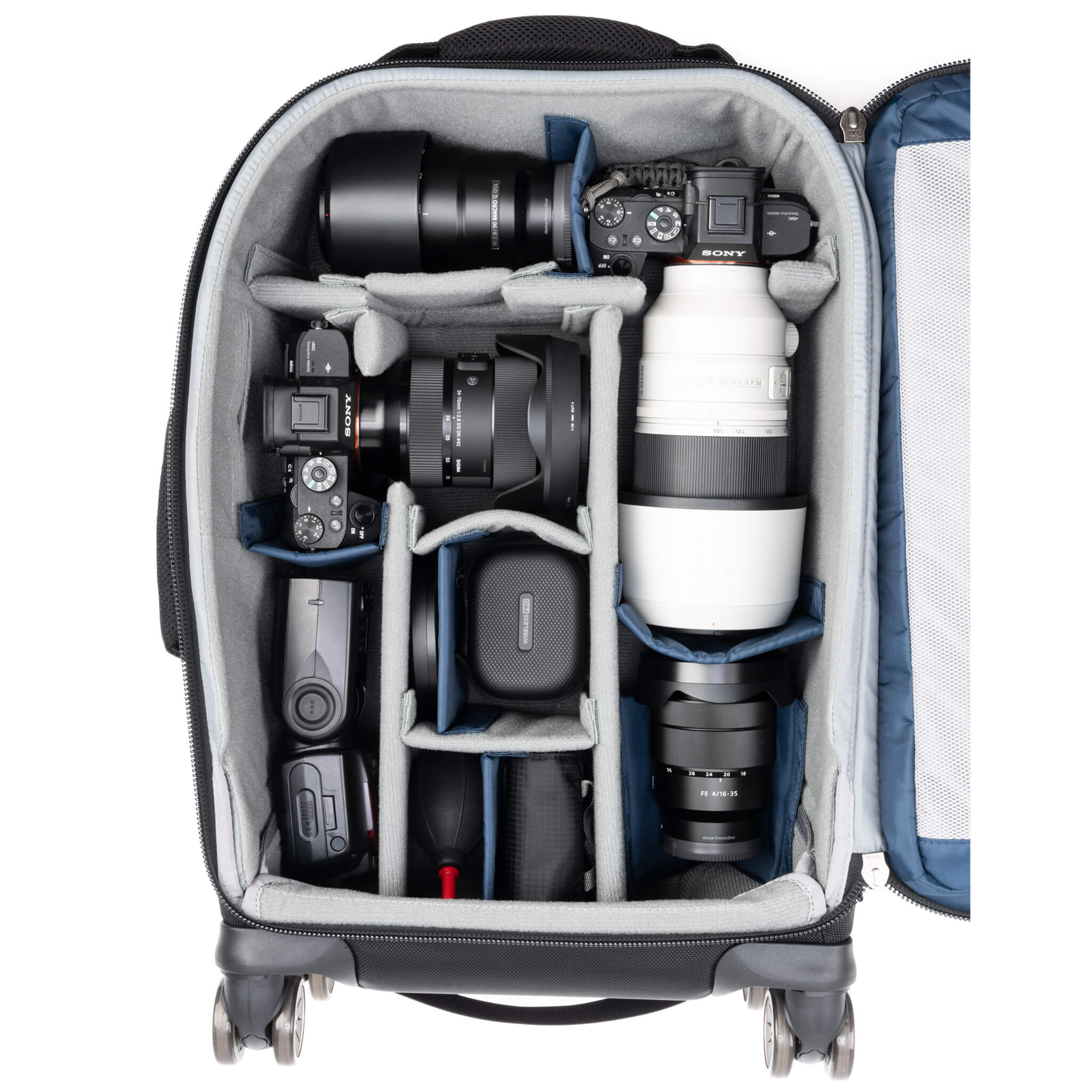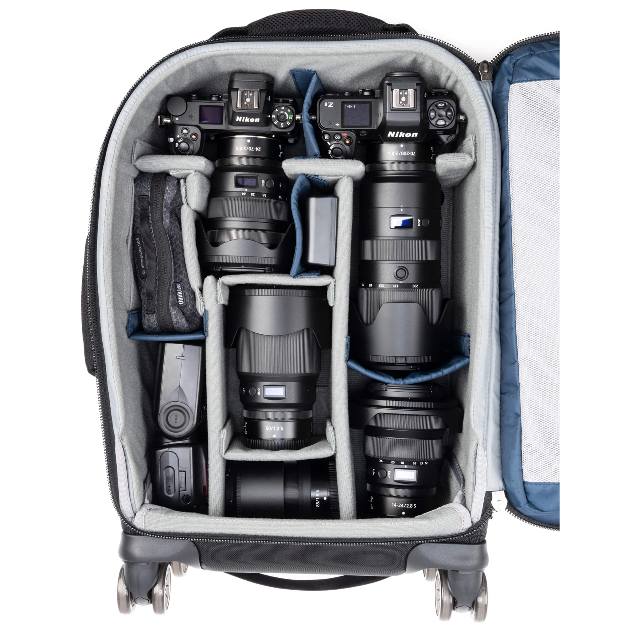 Airport Roller Derby V2 Canon R5 with 70-200mm f/2.8 mounted, R3 with 24-70mm f/2.8 mounted, 50mm f/1.2, 85mm f/1.8, 2x Extender, 580EX Airport Roller Derby V2 Back wheel tilt Side wheel tilt Nikon Z8 mounted to 70-200mm f/2.8, Z9 mounted to 24-70mm f/2.8, 14-24mm f/2.8, 85mm f/1.8, 50mm f/1.2, Flash 2 standard-size camera bodies with lenses attached Lock and cable to secure and tether the bag. Computer compartment now includes Lockable YKK® RC Fuse Zippers Interior zippered mesh pockets for batteries, CF cards, filters, and other accessories 1 gripped camera body and 1 ungripped camera body both with