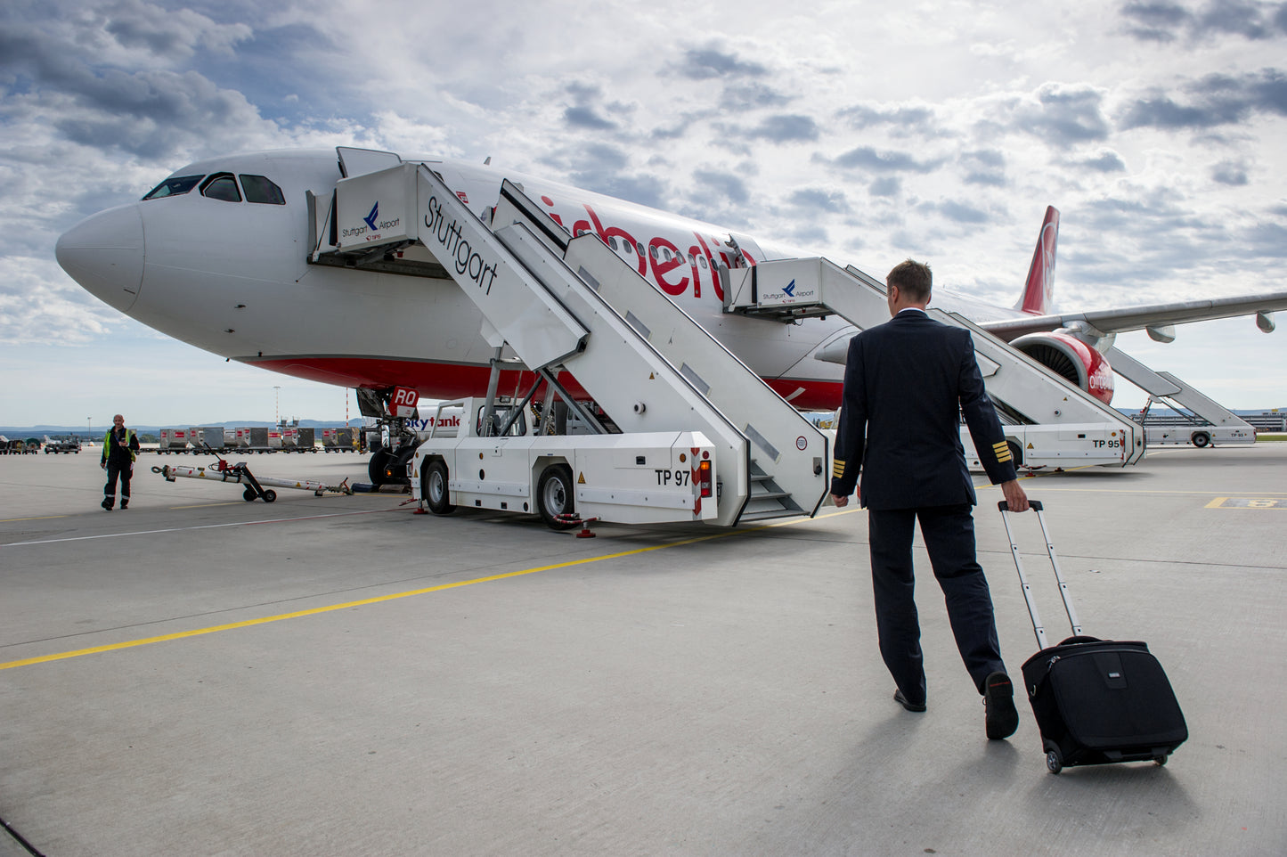 A photographer holding a camera to his face, and standing in-between a roller backpack and a black car